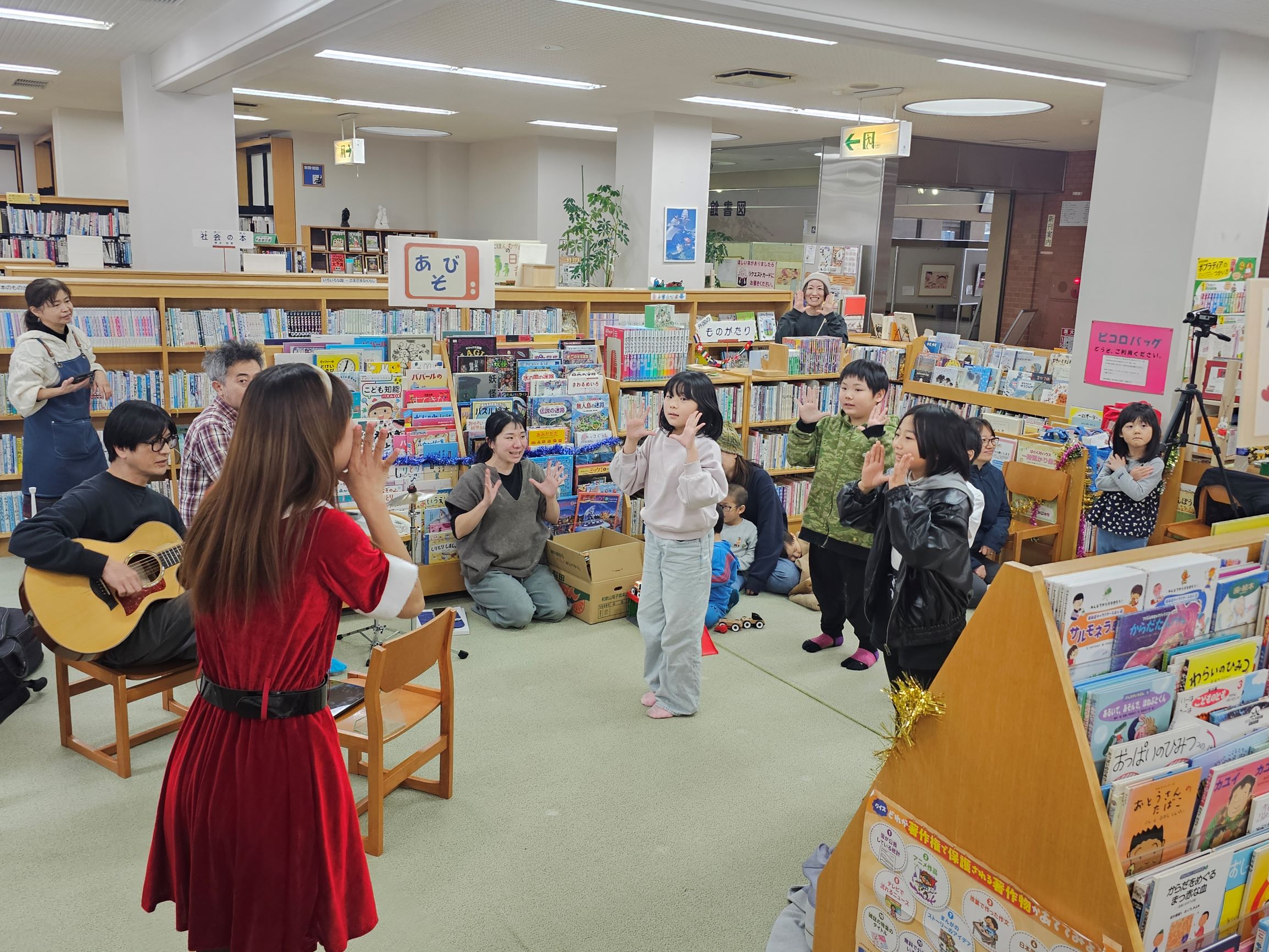 12月20日(土)、クリスマスが近くなる中、ノロッスデュオの岩瀬敬吾さんとハジ-ヤマグチユキヒコさんが図書館でイベントを開きました。