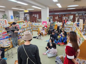 12月20日(土)、クリスマスが近くなる中、ノロッスデュオの岩瀬敬吾さんとハジ-ヤマグチユキヒコさんが図書館でイベントを開きました。